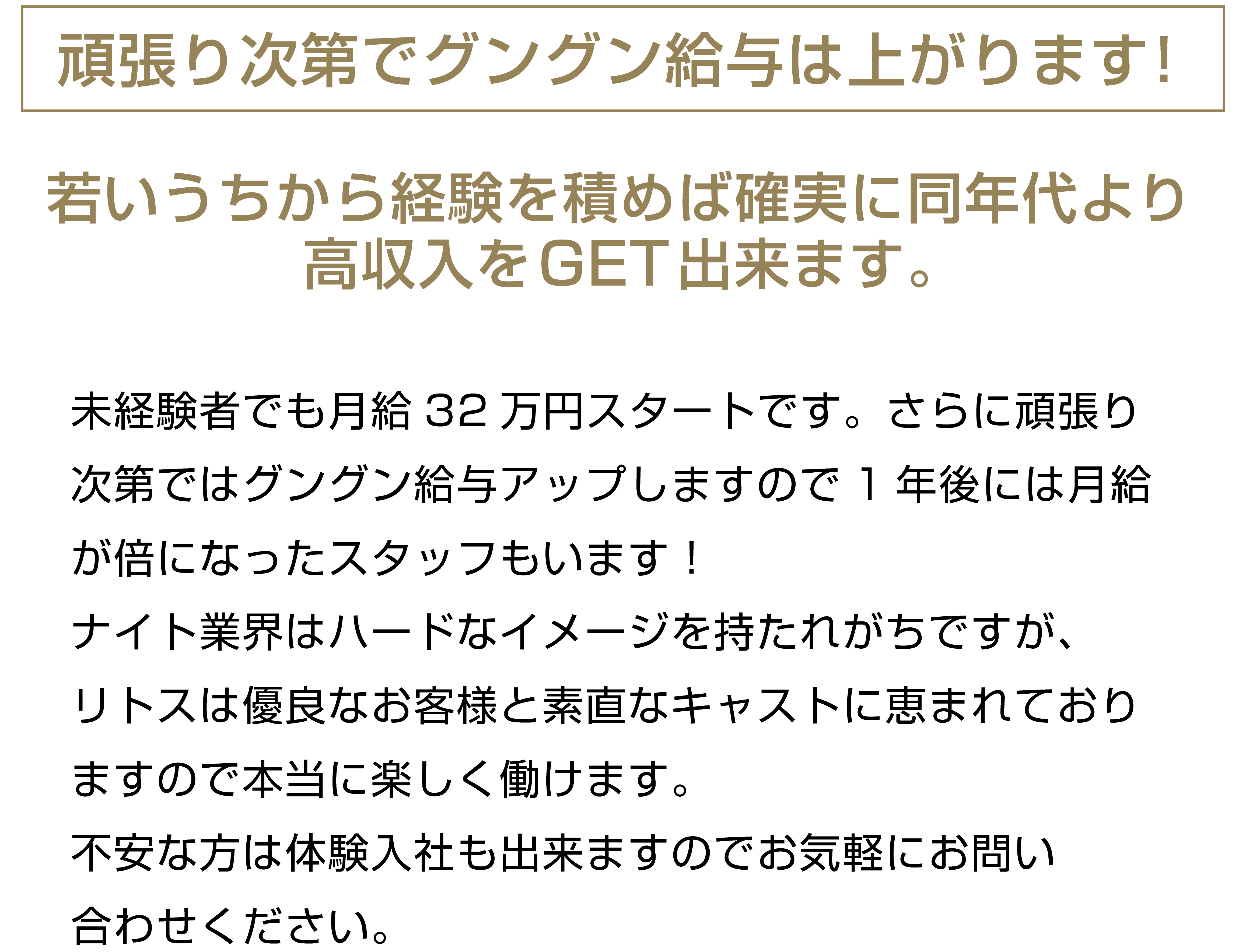 | 各種歩合、役職手当、昇給昇格随時 | |